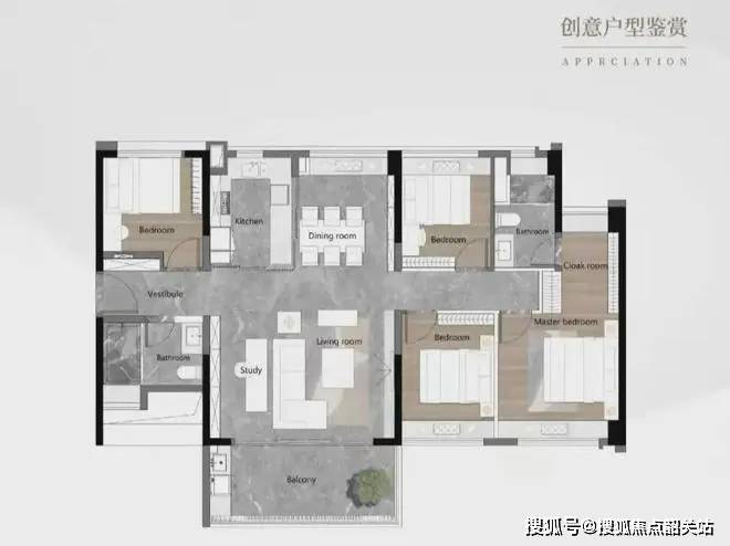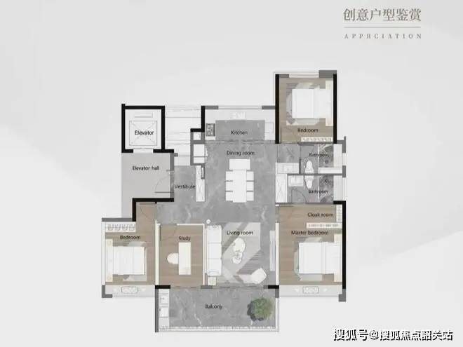 为了更好观赏园林景观,这个户型的阳台延伸到了其中一个卧室,不过由于与阳台相连,卧室的私密性会差一点。
