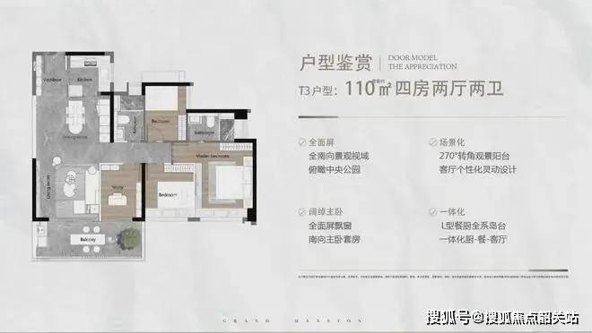 110㎡四房户型,竖厅设计,四开间朝南,主卧带独立卫浴,还做了LDK餐客厨一体设计,空间感大。
