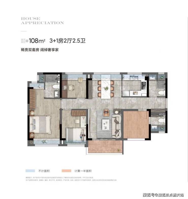 D户型丨4 房 2 厅 2.5卫丨 建筑面积约 108㎡