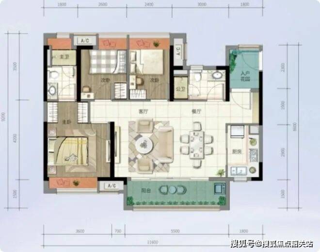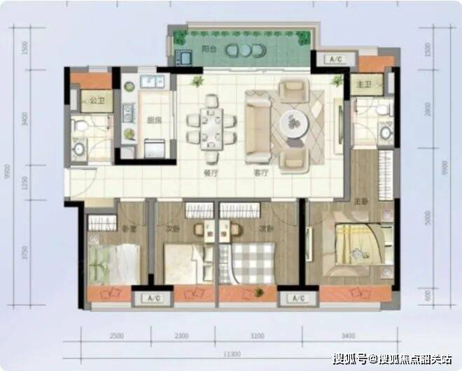115平方米户型:四房设计,宽敞的客厅与餐厅相连,适合三代同堂或二孩家庭,提供了相对独立的休息空间,并配备完善的收纳设施。