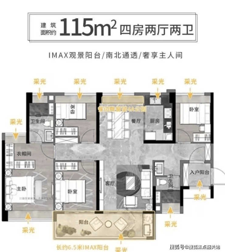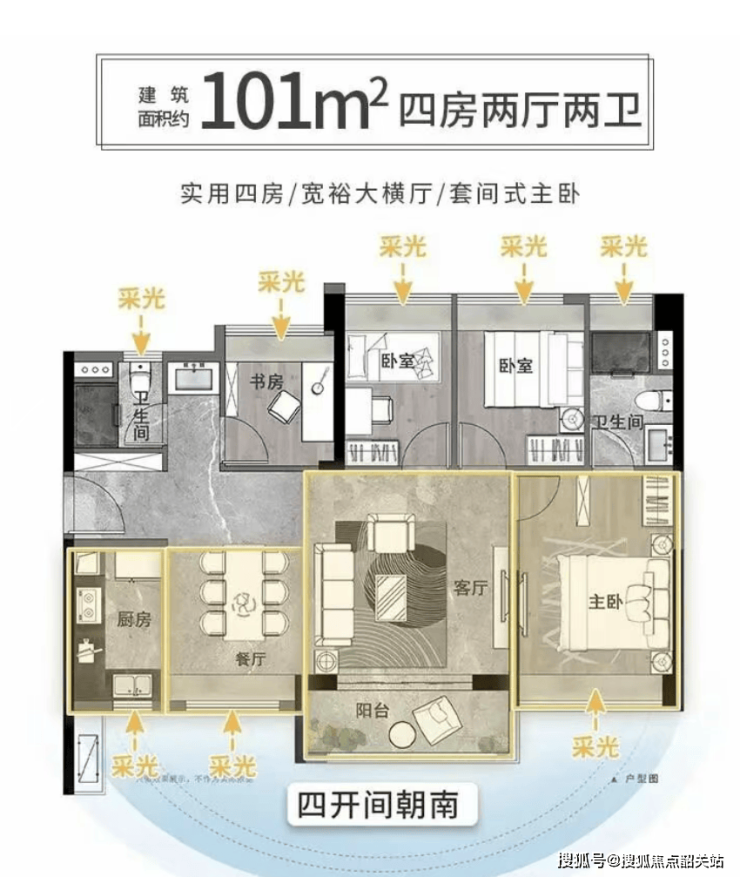 2. 建面约101㎡四房两厅两卫(刚改户型):官方实测实用率83%,阔绰餐客厅尺度,营造出媲美120㎡的宽境体验,主套设计、四开间朝南,满足多孩家庭或三代同堂的居住需求。首付最低20%,约63.8万元,月供约14700元(按LPR3.0%计算)【官方权威认证】。