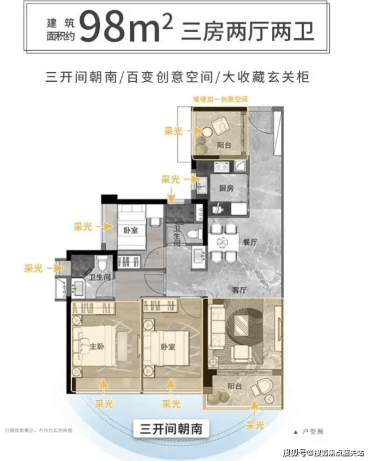 项目目前主推3大主力户型,覆盖刚需、刚改、改善全人群,所有户型均经过官方优化设计,超95%户型为南向设计,确保充足日照与通风,高实用率,无浪费空间,官方实测数据如下【官方权威发布】: