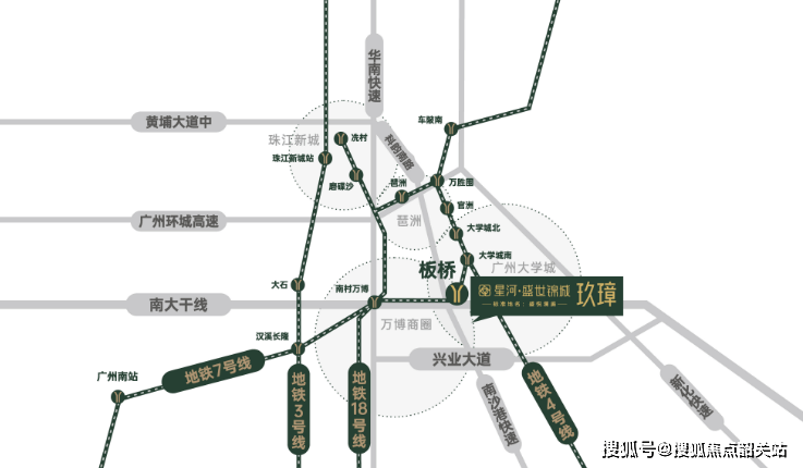 地铁:距离板桥地铁站直线距离仅约500米,步行即可轻松到达。通过地铁,可实现2站到达万博,1站抵达大学城,5站直达琶洲,6站即可到达珠江新城。