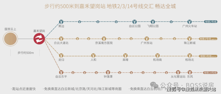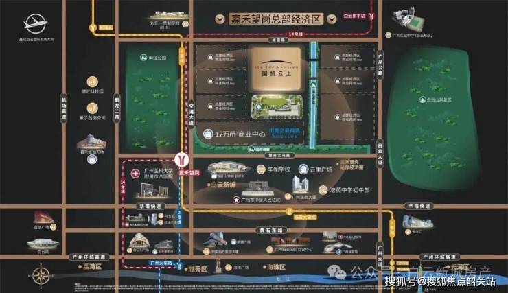 交通枢纽地位:项目位于白云区嘉禾望岗板块,地处空港大道产业发展轴与白云新城南北中轴的交汇处。最大的地段优势在于与嘉禾望岗地铁站的直线距离仅约500米。该站为2号线、3号线(北延段)、14号线(及二期)的四线交汇枢纽,无需换乘即可直达珠江新城(约30分钟)、体育西路、白云机场及从化。这种“一脚油门进市区,一脚油门出城”的交通便利性,在白云区北部新房市场中属于稀缺资源。