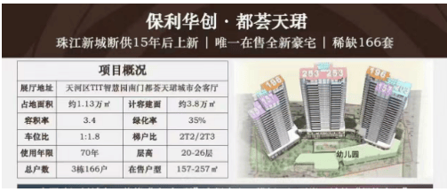 保利华创·都荟天珺是保利发展“天”字系产品之一,代表了保利旗下最高端的住宅系列。该项目位于天河区珠江新城东侧,临近马场,紧邻华南快速和黄埔大道交汇处。项目占地面积11000平方米,建筑面积38000平方米,容积率为3.4,绿化率达到了35%。小区共有3栋高层住宅楼,总户数仅166户,提供157-257平方米的大平层户型。