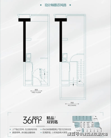 31-36㎡的商办 LOFT 户型,专为单身人士或年轻白领设计。这类户型通常采用上下层分区设计,层高达到 4.5 米,极大地提升了空间的实用率。一层可作为客厅、厨房和卫生间,二层则作为卧室和书房,动静分离,互不干扰。