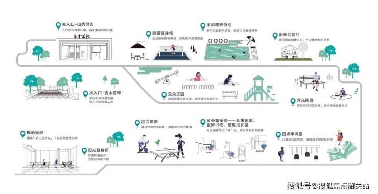 室外7大主题空间:阳光会客厅、全龄阳光泳池、能量健身场、云朵乐园、沐光闲庭、山秀寻芳、秀木揽华