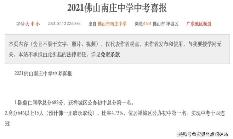南庄中学是广东省一级公办中学,禅城区公办初中第一名,中考十四连冠;去年中考,禅城区中考状元就出自南庄中学,总分646以上有15人,连续14年位居禅城区之首。