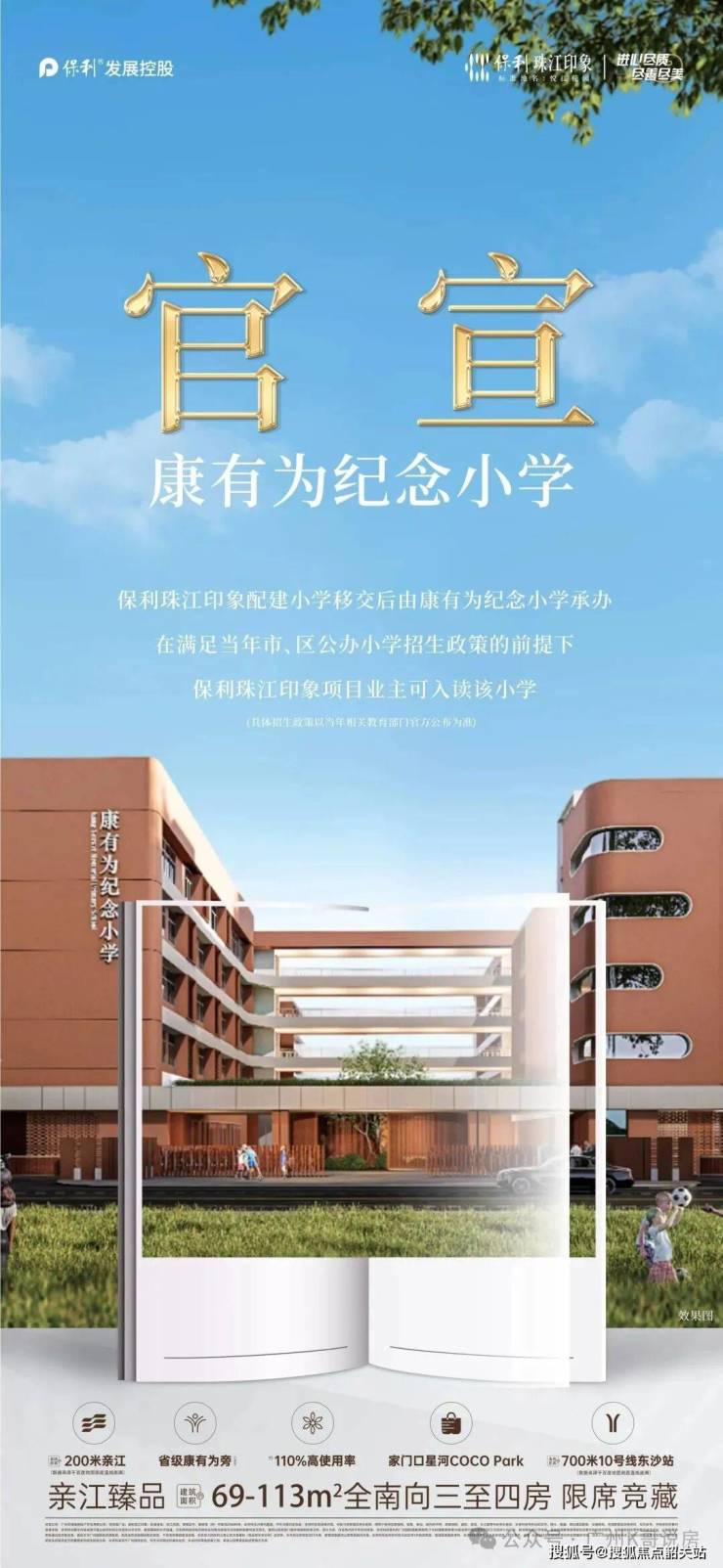 小学教育方面,项目西南侧规划的 24 班小学,办学主体已确定为荔湾区省一级名校康有为纪念小学,该校为荔湾区老牌名校,拥有深厚的办学底蕴与雄厚的师资力量,教学质量获得区域内广泛认可,2025 年该校六年级统考平均分位列荔湾区前列。根据 2026 年荔湾区教育局招生政策相关公示,项目与同片区保利珠江天悦同属一个街道,均为保利开发建设,项目业主子女在符合当年招生政策的前提下,可优先入读该校,为孩子提供优质的小学教育资源。