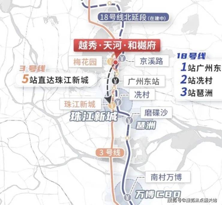 根据规划,待18号线北延段京溪路站开通后,从越秀天河和樾府出发,仅需2站即可到达冼村(珠江新城核心区),3站即可直达磨碟沙(琶洲人工智能与数字经济试验区)。这意味着,业主可以在极短的时间内,穿梭于广州最核心的三大经济圈之间:珠江新城、琶洲、南沙。
