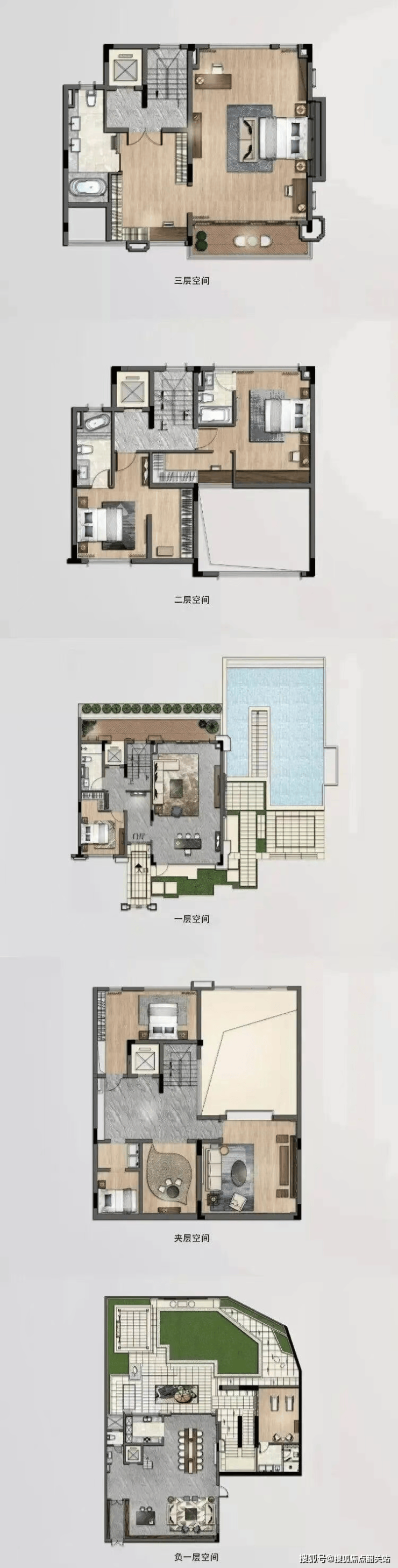 主力在售户型为165㎡、198㎡、216㎡三种面积段,均为地上三层、地下两层结构,采用“买三层送两层”设计,实际使用面积普遍在350–480㎡之间,空间延展性强,满足多代同堂或高阶生活场景需求。