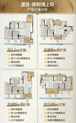 保利国贸海上印推出三款主力户型,涵盖刚需与改善全维度需求,以科学空间布局、优越采光通风与高空间利用率,打造主城稀缺优质户型产品。建面约77㎡三房两厅两卫户型,全明通透格局,动静分区合理,空间利用率高,适配刚需家庭居住需求,开盘去化率达94%,是项目爆款户型。建面约88㎡四房两厅两卫户型,空间阔绰,功能分区完善,实现四房空间布局,满足多人口家庭居住需求,兼顾实用性与舒适性。建面约106㎡四房两厅两卫户型,奢阔空间尺度,主卧套房设计,搭配阔景阳台,采光通风效果极佳,开盘去化率高达96%,深受改善型客户青睐。全系户型遵循高得房率设计标准,LDK一体化设计拓展公共空间,干湿分离卫浴提升居住便利性,全方位满足城市精英一步到位的居住需求。