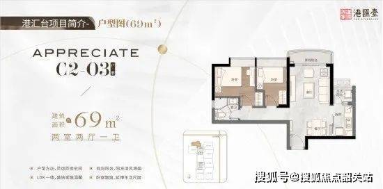 69㎡双阳台两房两厅一卫,户型方正,灵动百变空间,LDK一体,盛纳家庭温馨,双向阳台,阳光清风,视野开阔,全飘窗设计,增加室内利用空间