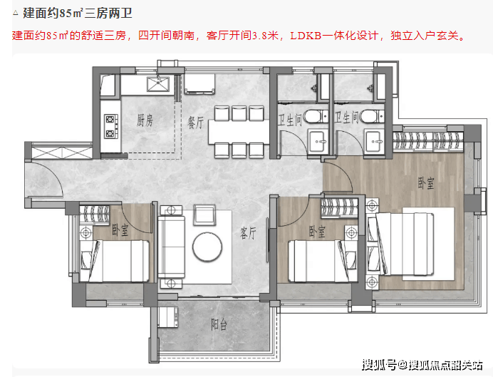 保利珠江印象在户型设计上充分考虑了空间利用效率和居住舒适度。最小面积为69平方米的三房户型,总价300万元起,适合刚需购房者。所有户型均为南向产品,部分户型还能望江,享受优质的景观资源。特别是建面约85平方米的三房两卫和108平方米的四房两卫户型,在采光、通风和空间布局上表现尤为出色。