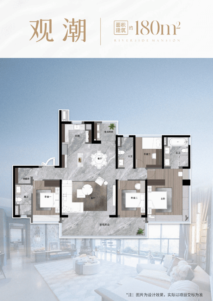 180㎡户型,以豪宅尺度打造高改产品,私梯入户提升仪式感;全屋 270°“霸屏式” 江幕,大面积玻璃幕墙让空间成为 “江景容器”;约 74㎡客餐厅气场开阔,双阳台 + 双套房设计,满足多代同堂隐私需求;全屋观江面达约 18 米,每个房间均配巨幕飘窗,甚至浴室可赏园景,实现 “处处是景观” 的居住体验,适合高端圈层家庭。所有户型开窗率最高达 68%,最大化引入自然光线与景观,新规设计提升空间利用率,细节处彰显豪宅品质。