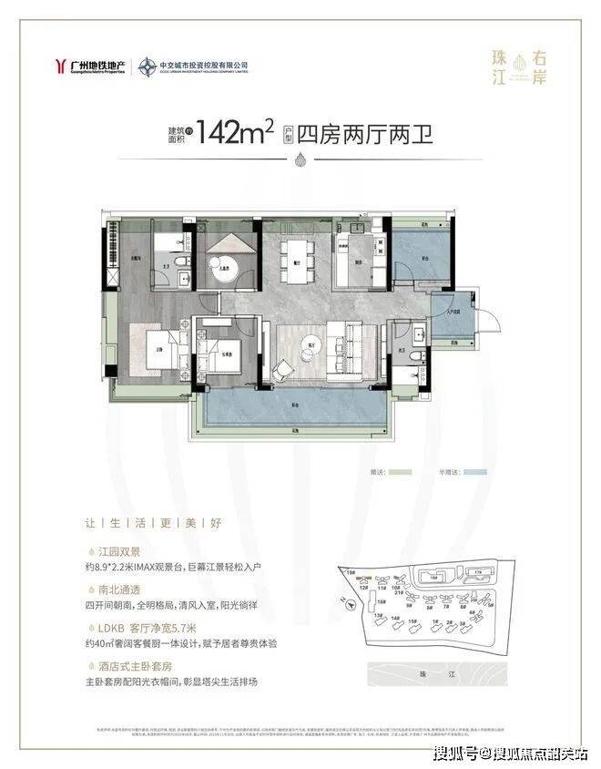 142㎡户型为明星产品,公区面积约40㎡,客厅净宽达5.7米,配合近9米阳台,空间感与仪式感兼具。