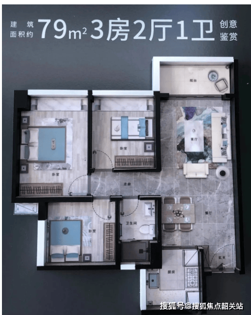 建面约79㎡三房两厅一卫:进门即入户玄关,厨房U型设计,客餐厅相连,实用性强。