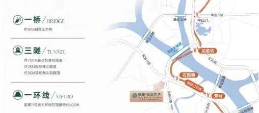 如意坊隧道是广州市重点建设的过江通道项目,旨在打通荔湾与海珠、天河之间的交通瓶颈,实现快速过江。该项目一期工程预计于2025年正式开通,届时将从根本上解决西片区过江难的问题。建鑫如意芳华距离如意坊隧道入口仅约700米,这意味着业主驾车出门不到一分钟即可驶入隧道,瞬间穿越珠江,直达对岸。