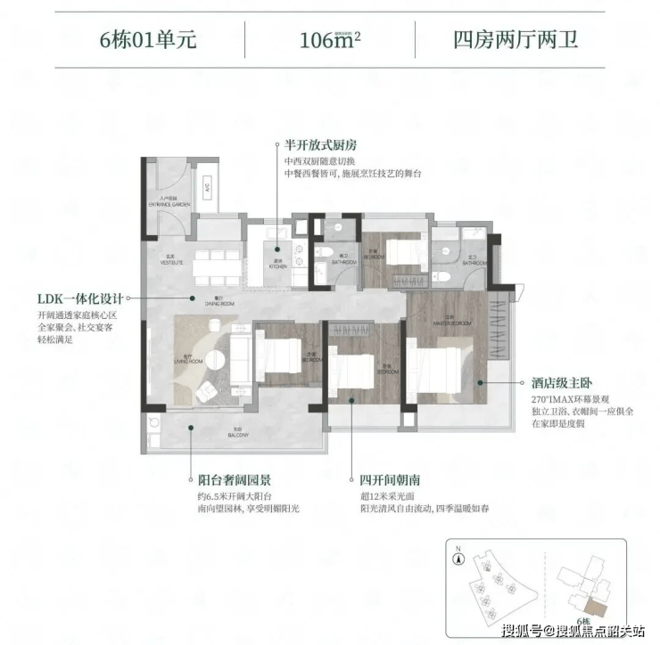 106-108㎡的四房户型,特别适合二胎家庭或三代同堂。108㎡的户型做到了标准的南北对流,阳台宽度达到6.8米,主卧配备了270°景观窗,采光和通风都达到了极致。