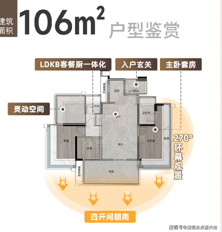 根据项目官方披露的户型信息,每款户型都亮点十足,其中106㎡东南向四房成为了开盘当天最抢手的“香饽饽”,备受购房者青睐。这款户型不仅四开间朝南,保证了充足的采光和通风,主卧、次卧都有270°飘窗,既能增加使用空间,又能欣赏云山美景,而且在整栋楼里是“凸出来”的户型,三面单边,基本没有自遮挡,看白云山的视野更舒展开阔。最关键的是,这款户型的总价不高,600万出头就能买到15、16层的“白云山头等舱”,性价比极高。