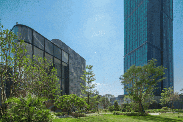 项目在公共走廊预留了垂直绿化带,打造特色的绿色瀑布景观,同时规划了「SKY PARK 天之艺境」空中秘境园林,为业主提供了休闲、观景、社交的公共空间。