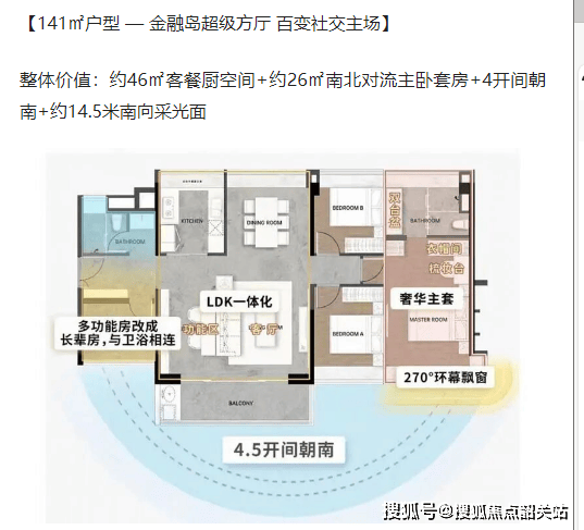 141㎡户型打造约 46㎡客餐厨空间,成为百变社交主场,满足家庭举办各类社交活动的需求。约 26㎡南北对流主卧套房,4 开间朝南,约 14.5 米南向采光面,使室内阳光充沛,视野开阔,为追求高品质生活和更多社交空间的家庭提供了完美选择。