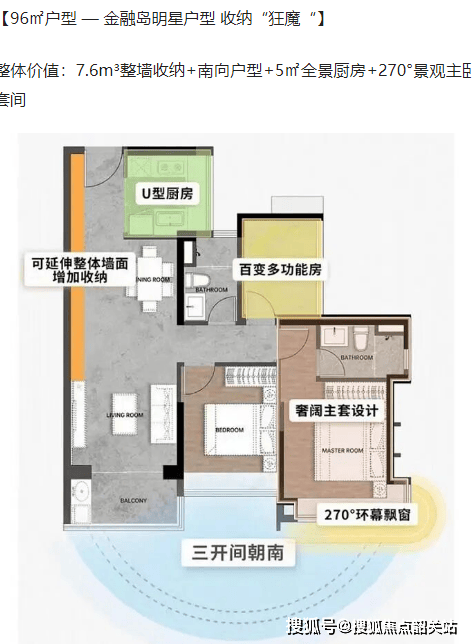 96㎡户型以其卓越的收纳设计成为金融岛明星户型,拥有 7.6m³ 整墙收纳空间,满足家庭日常收纳需求。南向户型确保充足采光和通风,5㎡全景厨房让烹饪成为一种享受,270° 景观主卧套间则为居住者带来独特的视野体验,适合追求精致生活的小家庭或单身贵族。