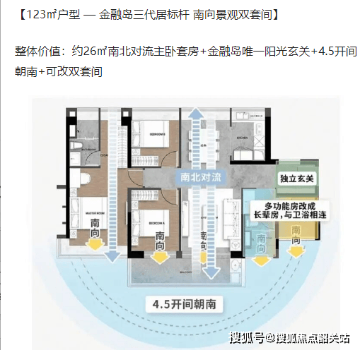 123㎡户型专为三代同堂家庭设计,约 26㎡南北对流主卧套房,提供舒适宽敞的休息空间。金融岛唯一阳光玄关,增加入户仪式感与空间通透感。4.5 开间朝南,保证室内充足光照。可改双套间设计,灵活满足家庭不同阶段的居住需求,是三代同堂家庭的理想之选。