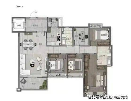 户型完全动静分区,但同时形成了长走廊占据了部分面积。4个卧室均带飘窗,主卧还有步入式衣帽间及独立卫浴。“+1房”目测面积较小,可用作书房或休闲室。