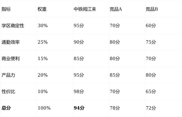 竞品对比:某盘虽近地铁,但学区未定、得房率低,综合性价比不如中铁;