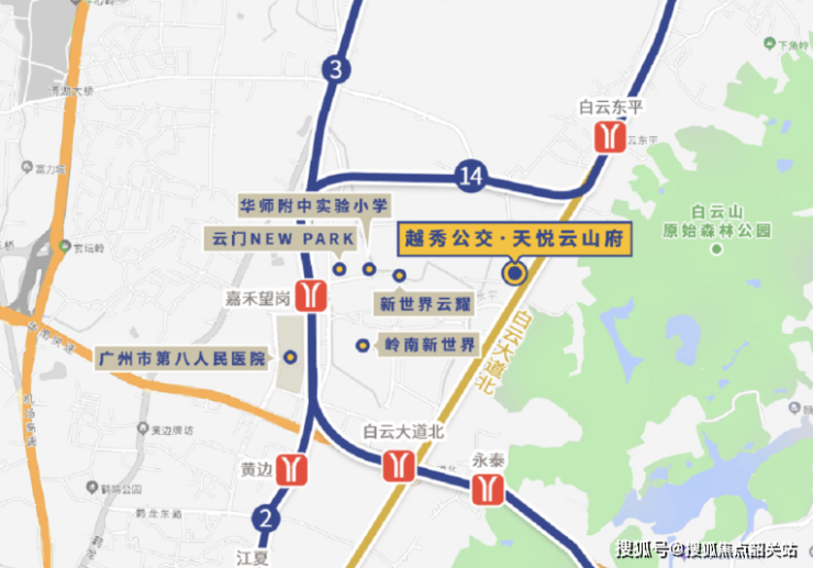 越秀天悦云山府在交通配套方面独具特色虽然距离最近的地铁14号线白云东平站约1.7公里距离地铁3号线白云大道北站约2.1公里但项目打造了广州首个公交TOD模式很好地解决了地铁出行的“最后一公里”难题
