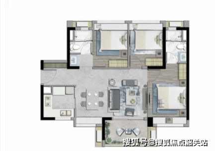 92㎡三房二卫:南北对流设计,配备270°阳台,双卫布局提升居住舒适度。