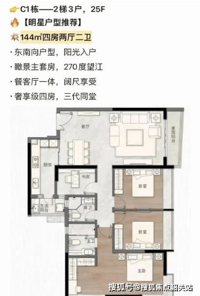 C1 栋 2 梯 3 户,主推东向 144㎡、127㎡户型,其中 144㎡主卧朝南;还有西向 117㎡户型。C2 栋 2 梯 4 户,户型分为东向的 124㎡及 113㎡、南向的 96㎡、北向的 69㎡,多样的户型选择能够满足不同家庭结构和需求。
