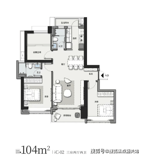 约104㎡三房:南向三房+南北双阳台,功能分区合理,会客空间宽敞;