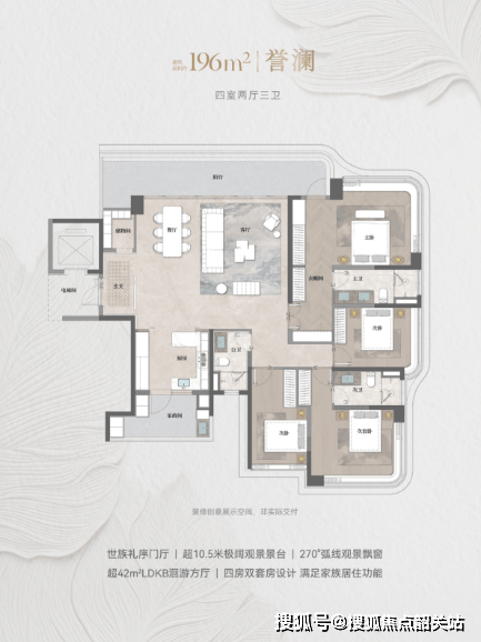 誉澜:建面约196平方米,四室两厅三卫,宽敞舒适。