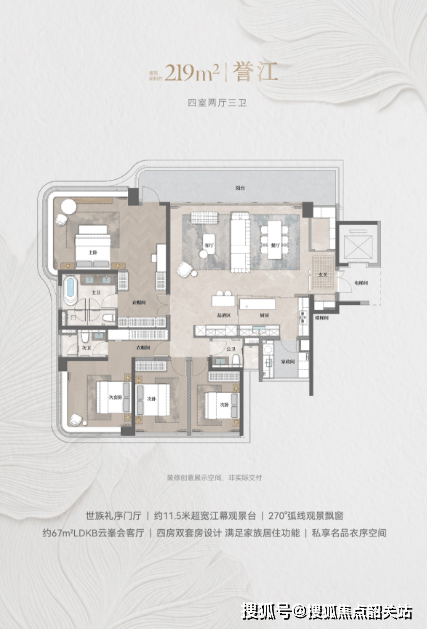 誉江:建面约219平方米,四室两厅三卫,尽享一线江景。