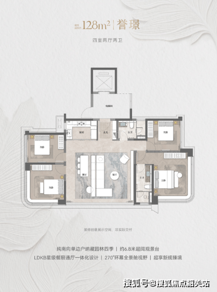 誉璟:建面约128平方米,四室两厅两卫,紧凑实用。