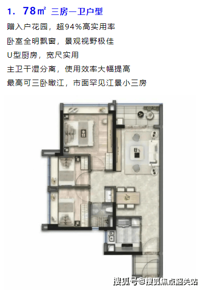 户型设计丰富多元,从刚需到改善皆有涵盖。78㎡江景小户三房,赠入户花园,超 94% 高实用率,卧室全明飘窗,最高可三卧瞰江;88㎡南向 270° 望江三房,宽尺主套设计,预留衣帽间空间;110㎡四房南北双阳台对流,近 99% 超高实用率;140㎡四房方正宽奢布局,巨幕观景阳台。此外还有公寓与别墅产品,满足不同家庭结构、不同购房需求人群,无论是新婚夫妇、二孩家庭还是三代同堂,都能找到心仪户型。