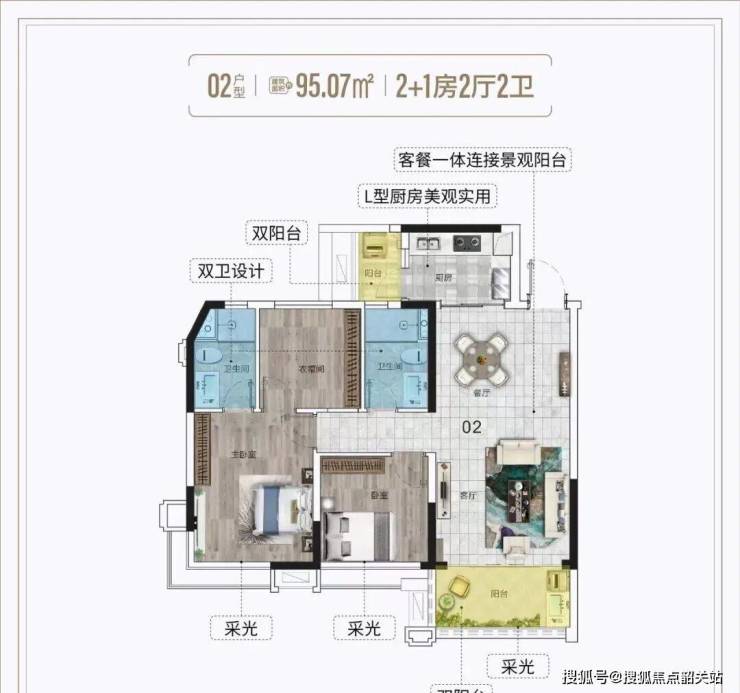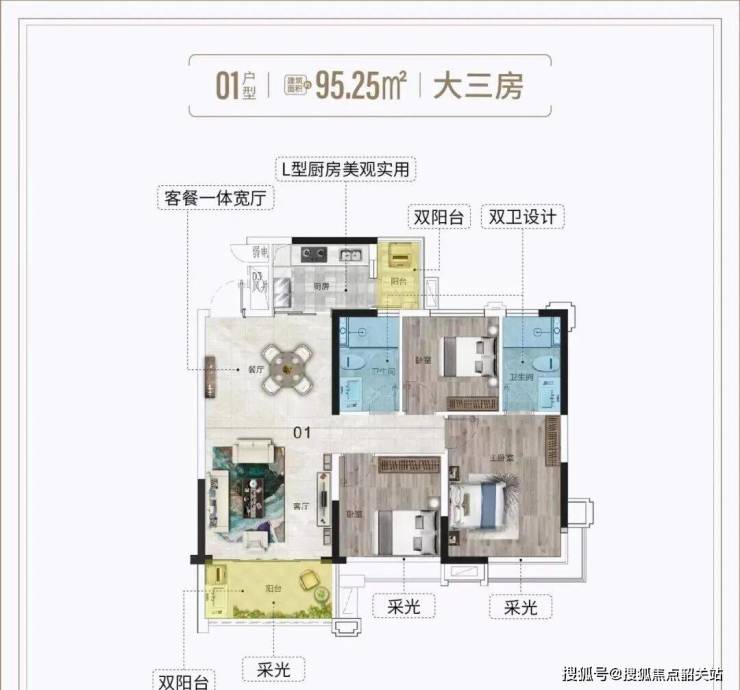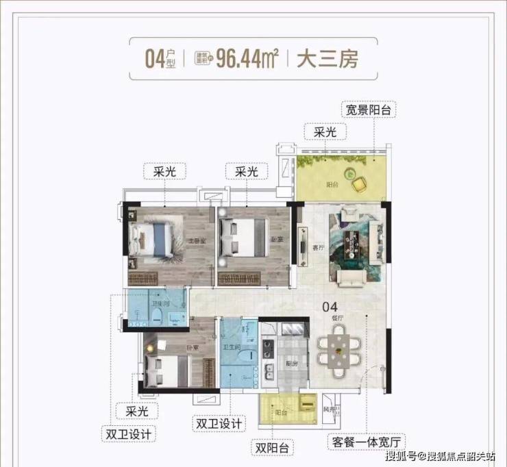 建面约95㎡:三房两厅,单边位设计,多开间朝南,阔景阳台无遮挡,俯瞰中央园林与城市景观。