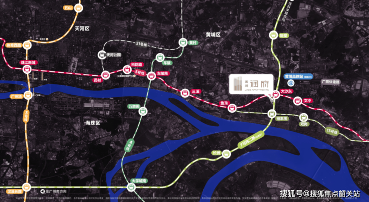 黄埔润府坐落在老黄埔的心脏地带,紧邻广州市第二CBD核心区。项目北面一路之隔是原黄埔区政府,直线距离约600米到保利中央公馆和黄埔体育馆;东侧则是万科城市之光,对面即是惠润广场。项目距地铁5号线和7号线换乘站大沙东站仅300-400米,步行即可到达。这两条地铁线路不仅连接了广州东西、南北各大CBD和产业新城,还承载着粤港澳大湾区城市之间协同发展的重任。此外,临近在建中的鱼珠隧道及规划中的黄埔高铁站,进一步提升了项目的交通便利性。