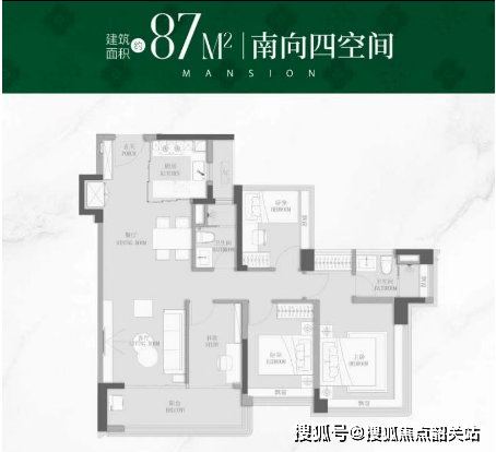 建面约88㎡四房:超高使用率,LDKB一体化布局,灵活多变的空间设计,适合年轻家庭。