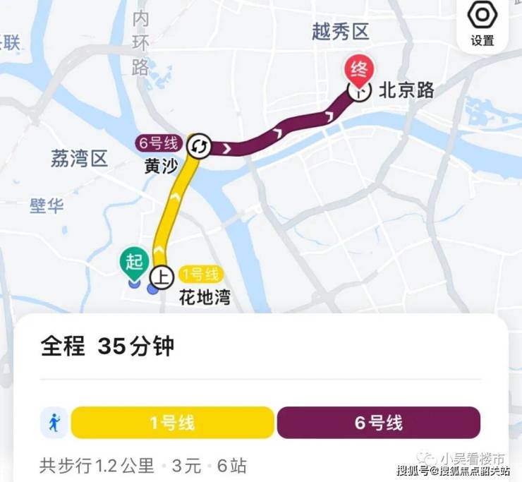 地铁去往北京路:项目步行至地铁口,坐1号线地铁至黄沙换乘6号线,共6站到达越秀区北京路,全程耗时35分钟。