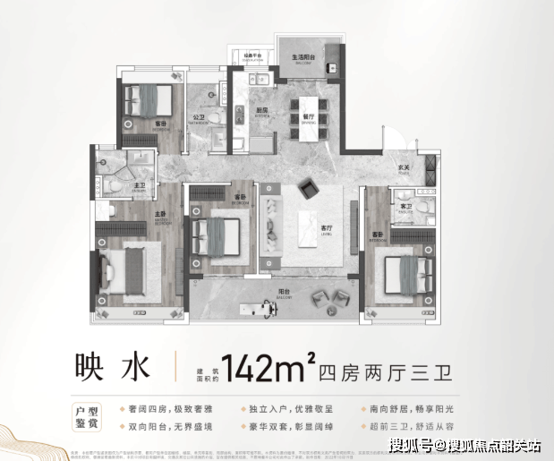 对于追求高品质生活的改善型客户,142㎡的奢阔四房无疑是最佳选择。这款户型采用了纯板式设计,南北对流双阳台,通风采光效果极佳。两梯两户的尊崇配置,大大减少了等待电梯的时间,提升了出行的效率与私密性。