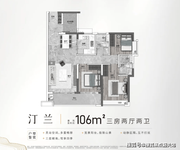 随着家庭成员的增加,106㎡的三房户型成为了许多家庭的首选。这款户型同样采用了南北对流的设计,高效实用的空间布局,能够轻松满足大家庭的生活需求。阔景阳台是其最大的亮点,超宽的采光面,将四季的景观尽收眼底。无论是春日的繁花,夏日的绿荫,秋日的硕果,还是冬日的暖阳,都能在阳台上细细品味。
