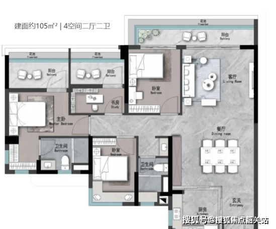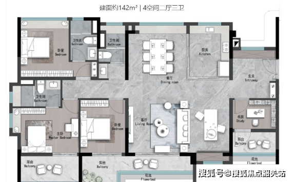 建面约123㎡三房户型,是板块内的性价比之王,总价680万左右,在天河核心区能用二手价买新房。该户型南北通透,客厅和餐厅相连,形成开阔的公共活动空间。阳台采用全景设计,视野开阔,能够欣赏到园林美景。三个卧室均带有飘窗,增加了空间的使用面积,同时提升了居住的舒适度。