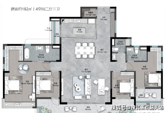 建面约182㎡四房户型,为改善型购房者量身打造。户型布局方正,空间开阔大气。四个卧室均为套房设计,保障了每个家庭成员的隐私和舒适度。客厅采用大横厅设计,连接超大阳台,采光通风效果一流。厨房配备中西双厨,满足了不同的烹饪需求,适合追求高品质生活的家庭。