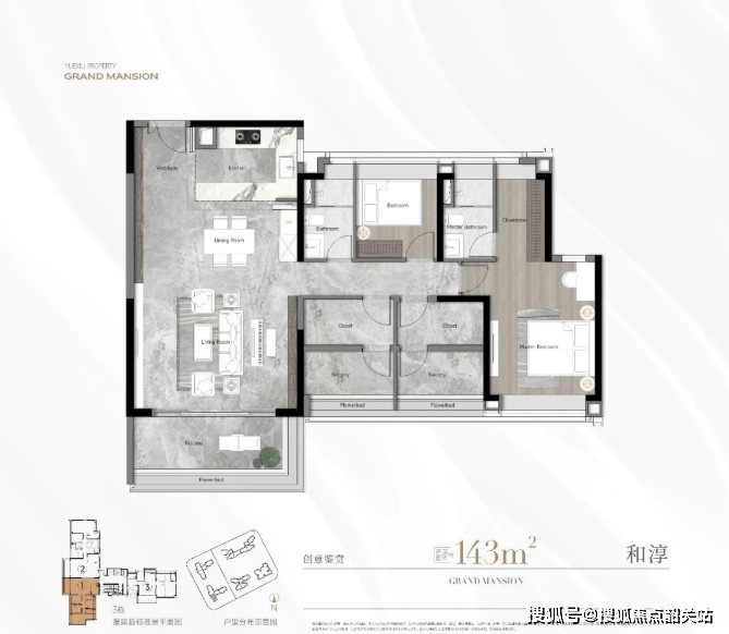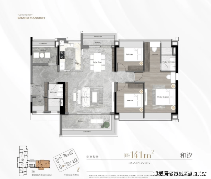 143平米四房:采用竖厅设计,实现动静分区,四开间朝南,配备270°观景阳台。