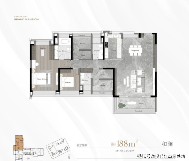 188平米灵动五房:五开间朝南,长达18米的景观面,带有接近60平米的LDKB南北对流大方厅,双主套设计,可观赏广州塔美景。