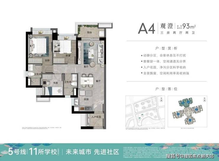在售组团包括阅海、观澄和中央公园三大组团。阅海组团和观澄组团户型多样,主打88-93㎡三房、123-143㎡四房产品,靠近公园和学校。中央公园组团则主打高实用率,赠送面积较多,户型覆盖75-88㎡三房及105-142㎡四房,使用率高达95%以上,预计在2024年底至2025年6月交楼。对于追求性价比和现房交付的刚需与改善型购房者来说,选择空间丰富。