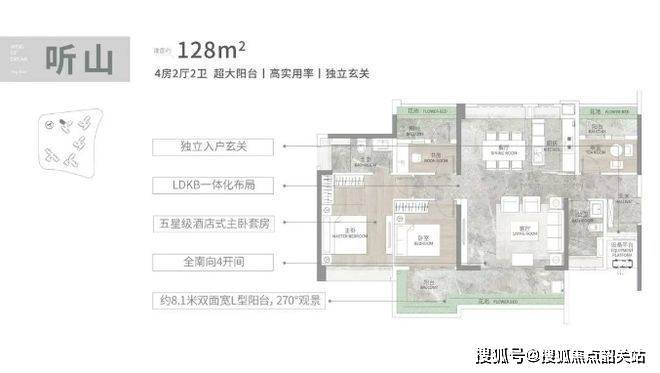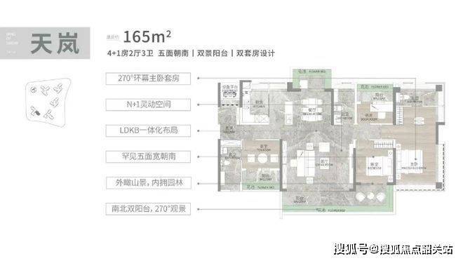 户型设计亮点满满,得房率高达 90 - 100% ,层高 3.1 米,次卧全景落地窗。建面 108 平 3+1 房,四开间朝南,近 6 米南向阳台,270 度景观,LDKB 一体化设计。建面 128 平四房,L 型独立玄关,8 米 L 型阳台,南北对流。建面 140 平 4+1 房,南向采光面达 15.7 米,南北双阳台。建面 165 平 4+1 房大平层,双阳台南北对流,朝南面宽 17.4 米,双主套设计。全屋统一高定奢装标准,结合南方气候特点,全系标配装配式全维多层防潮护墙板、国际一线品牌中央空调和新风系统,提升居住品质。